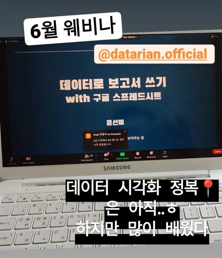데이터리안에서는 매달 데이터분석과 관련된 주제로 웨비나를 진행하는데 이번 달 웨비나 주제는 데이터분석에서 뗄레야 뗄수 없는 시각화와 데이터로 보고서 쓰기를 주제로 강의가 진행되었다.