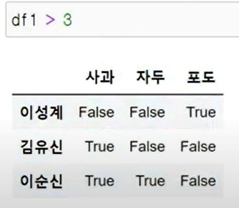 df1.values > 3 = 넘파이 형식의 출력 값