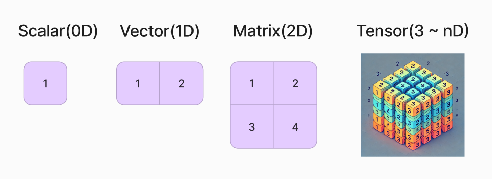 DA Damla 2025. 2. 2. 20:23딥러닝은 결국 "텐서 간의 연산의 값을 비교하는 과정"이라고 볼 수 있다. 그렇기 때문에 딥러닝의 스칼라 부터 텐서를 정리해보았다.